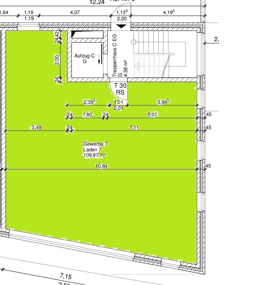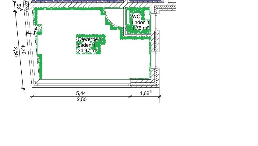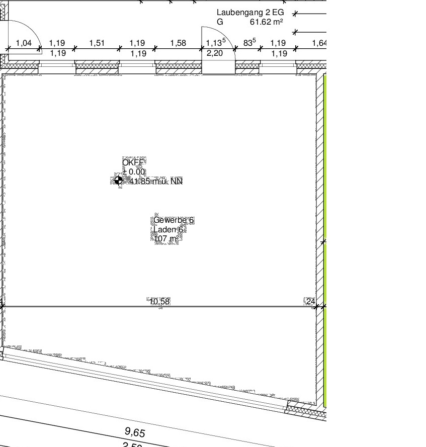 mit Gewerbe 1 / Laden 1 bezeichnet grün umrandet.