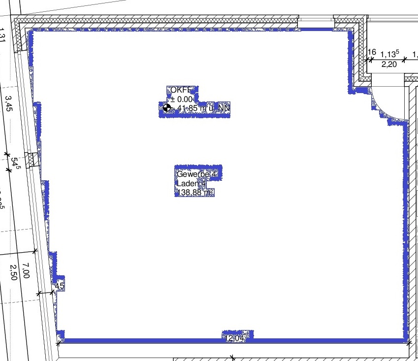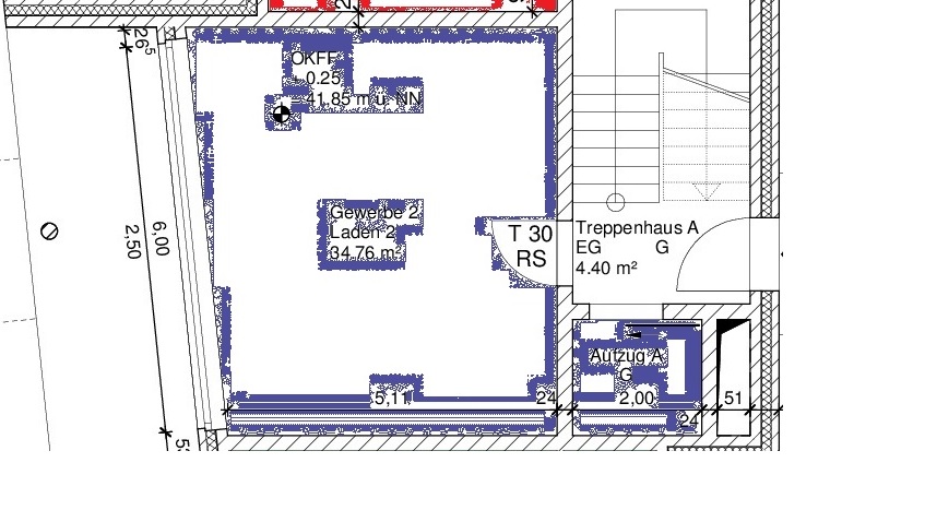mit Gewerbe 2 / Laden 2 bezeichnet dunkelblau umrandet.