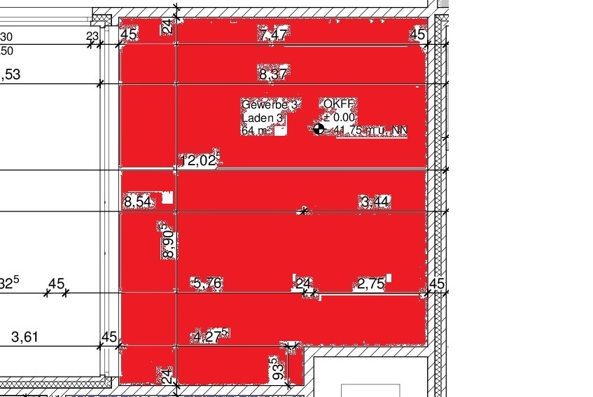 mit Gewerbe 3 / Laden 3 bezeichnet in Farbe rot dargestellt.